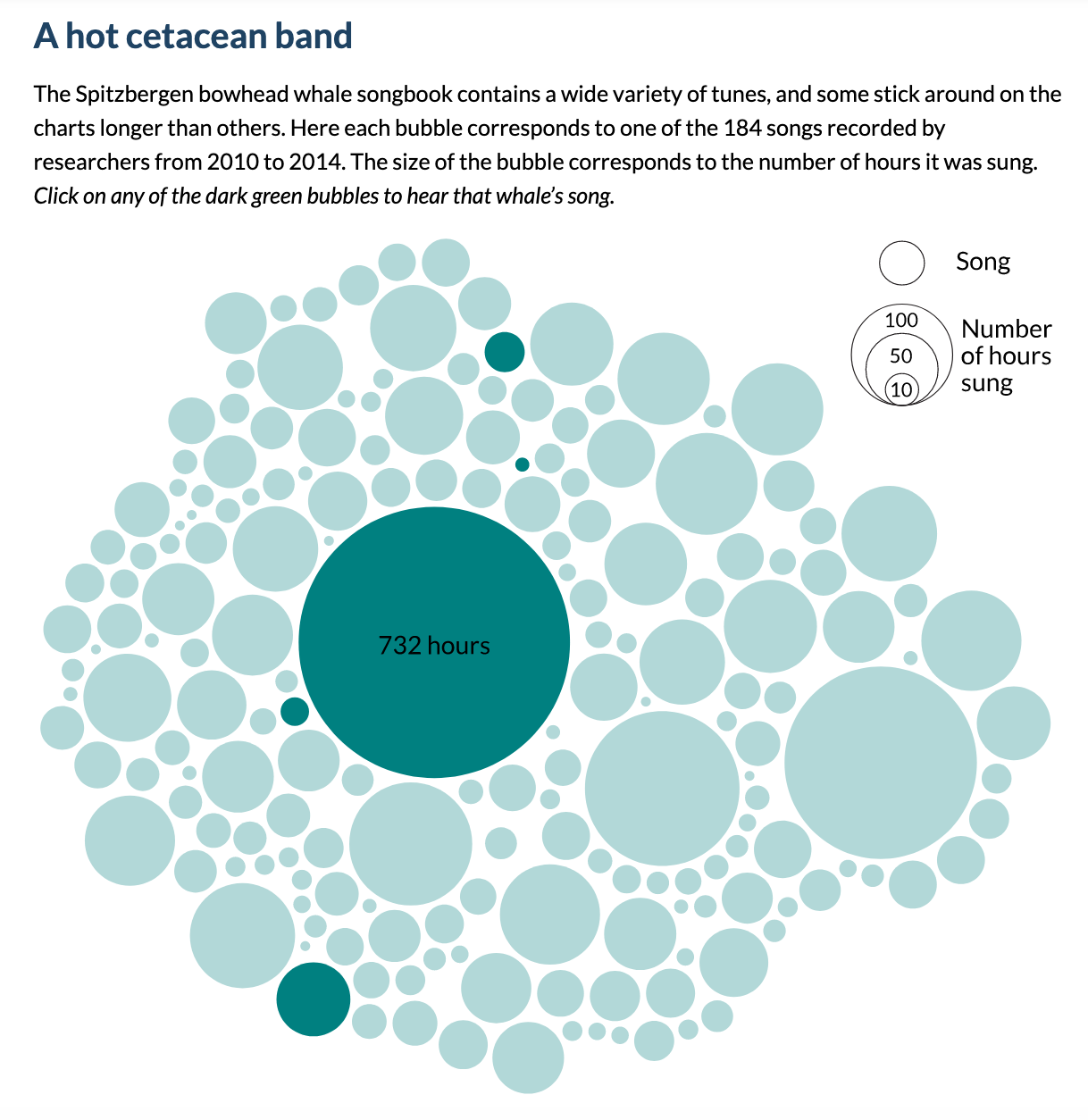 Whale song Data visualization For a short story about a massive bowhead whale song data set, I created a pretty basic interactive circle graphic where users could click on a few different songs and listen to them. Read the full story and see the interactive here. Related